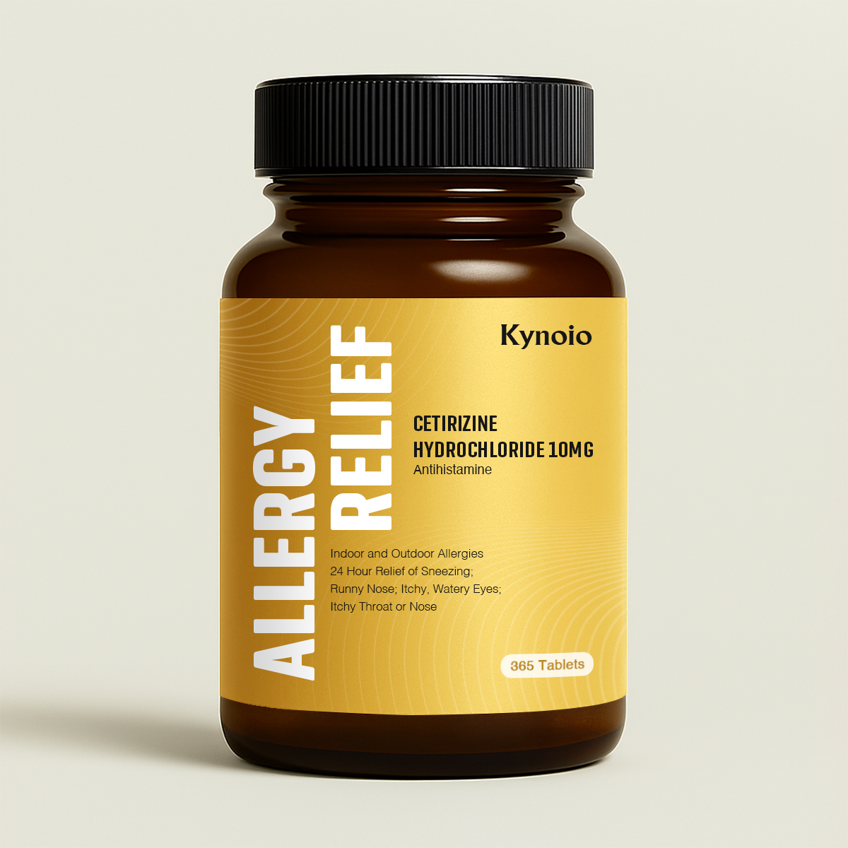 Kynoio Allergy Relief contains cetirizine, a second generation antihistamine that fights a chemical called “histamine” to counter allergy symptoms, such as sneezing, itchy eyes, and runny noses. When taken as directed, Kynoio Allergy Relief (cetirizine) provides powerful, long-lasting relief and treats both indoor allergies, like those to pets and dust, and outdoor seasonal allergies, like those to pollen and grass.
