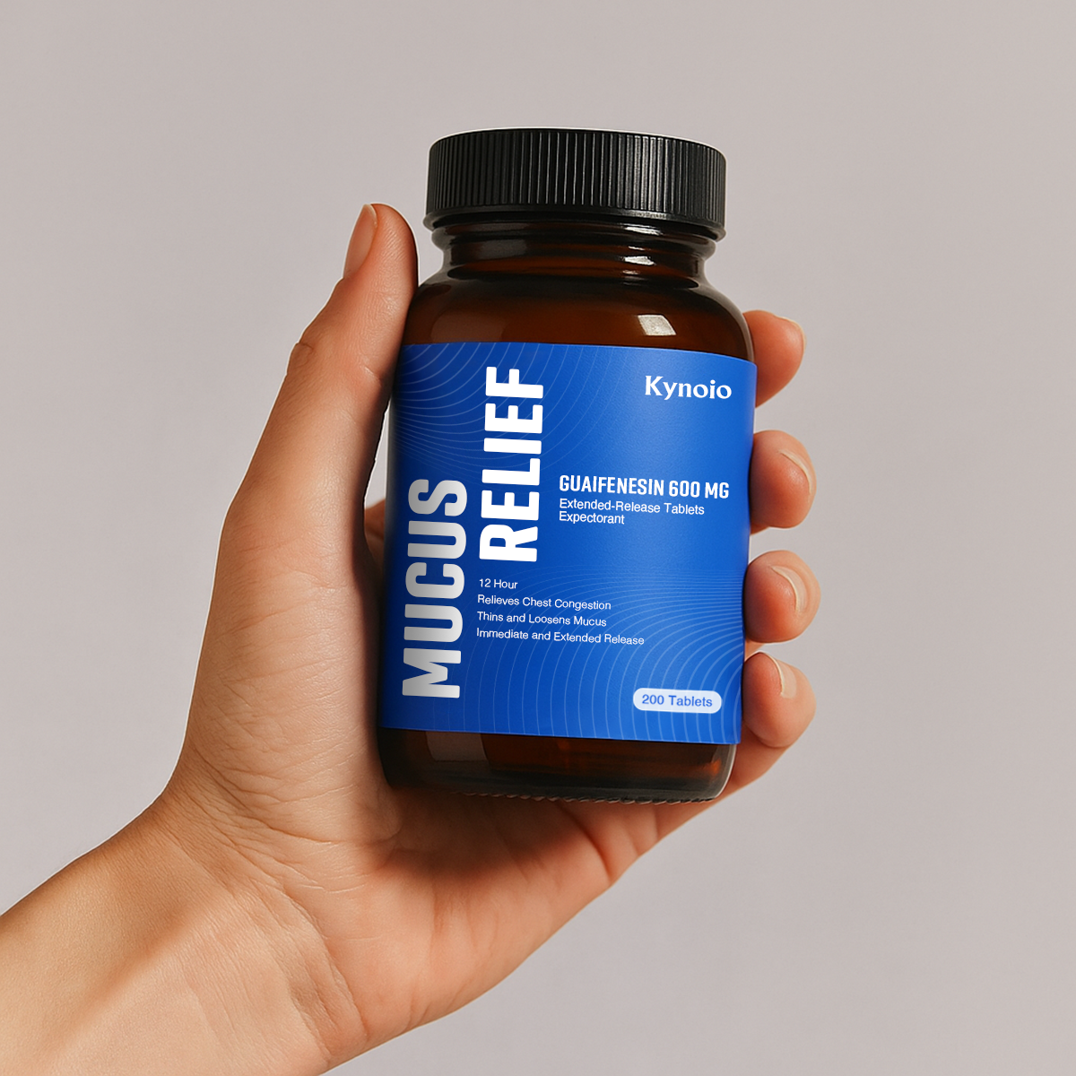 Kynoio Mucus Relief and Mucinex are two brands that both contain the same medicine at the same strength, guaifenesin 600 mg. Guaifenesin treats mucus and congestion caused by things like the common cold or flu. Kynoio Mucus Relief can be purchased online at a fraction of the price of Mucinex.